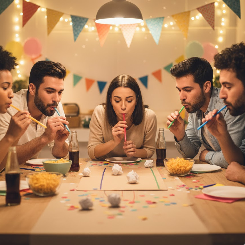 A fast-paced and funny game where players use a straw to move small items like candies or paper balls from one bowl to another.