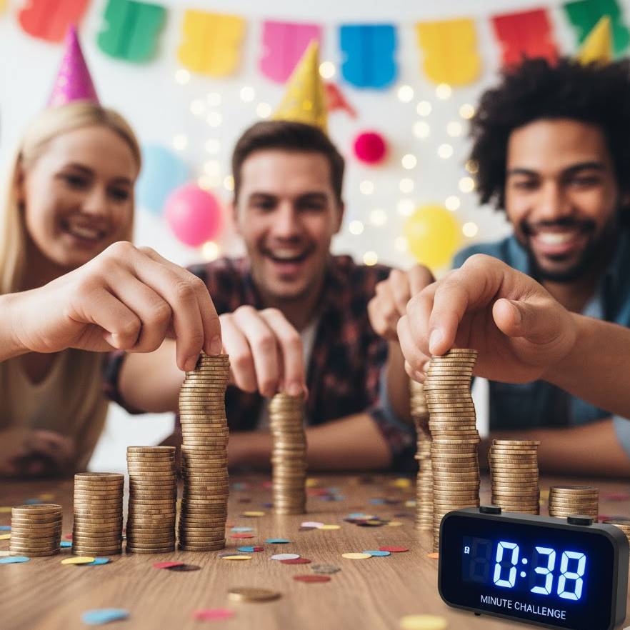 This game tests precision and calm under pressure. Players must stack as many pennies as they can using only one hand in sixty seconds.