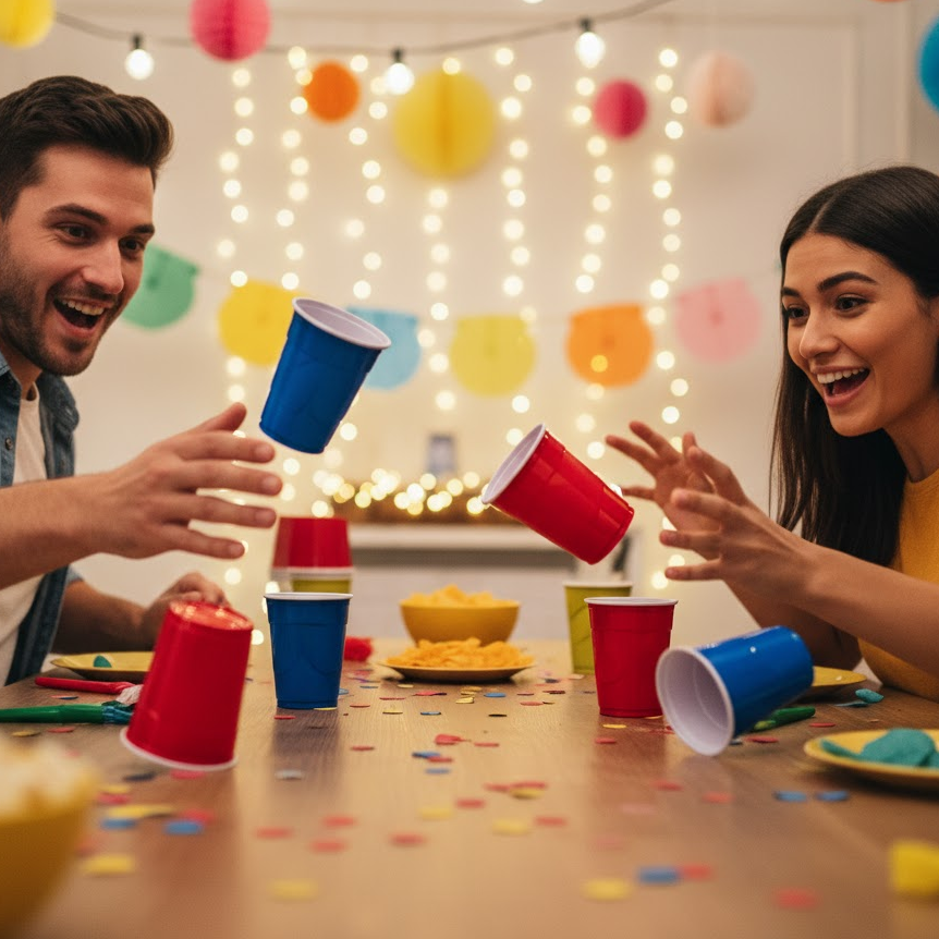 A crowd favorite that combines skill and timing. Players flip plastic cups from the table edge until they land upright.