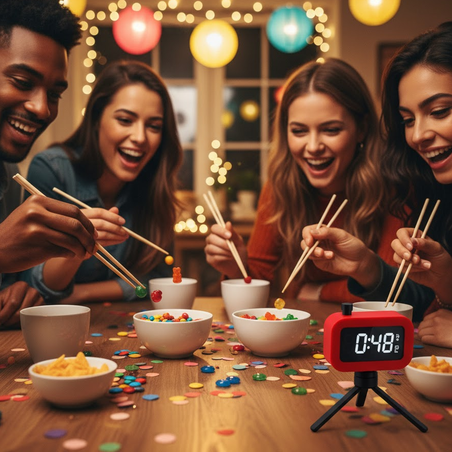 A fun test of coordination where players use chopsticks to move small items like candies or beads from one bowl to another.