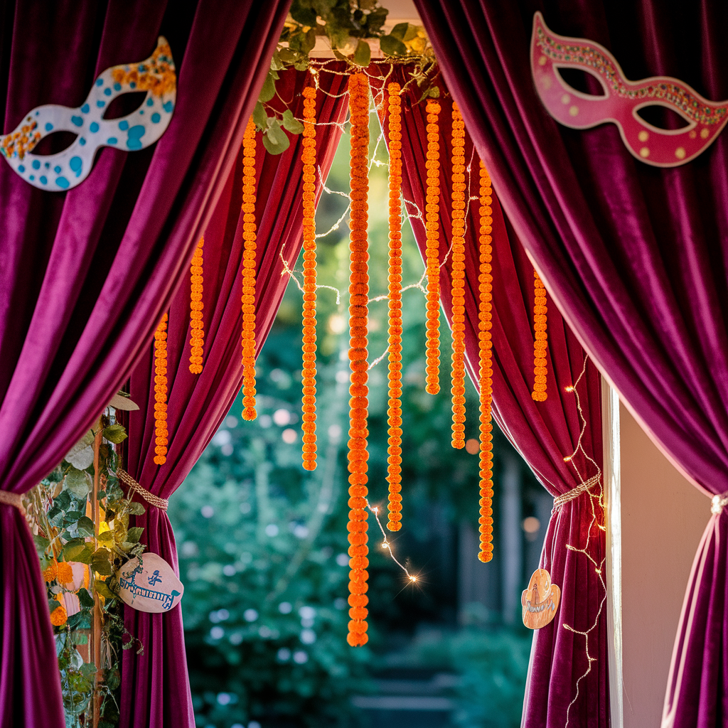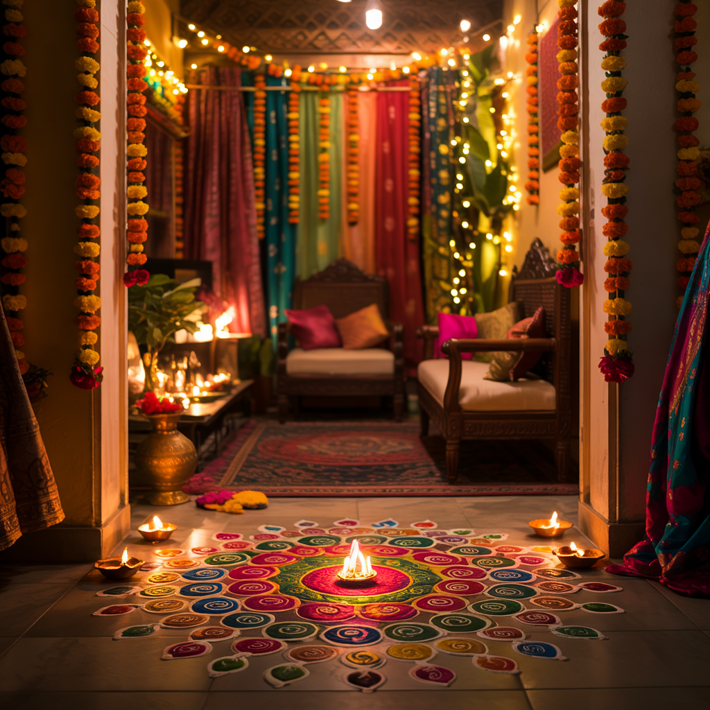 Your entrance sets the tone for the celebration. Decorate it with marigold flowers, fairy lights, and colorful curtains. A small rangoli at the doorway adds a beautiful festive touch and instantly feels welcoming.