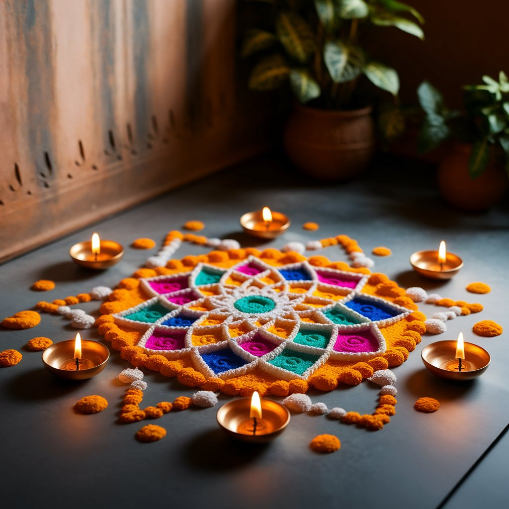 A rangoli area brings life and color to your home. You can create patterns with flower petals, rice, or bright colors. It doesn’t have to be perfect. The fun lies in making it together.