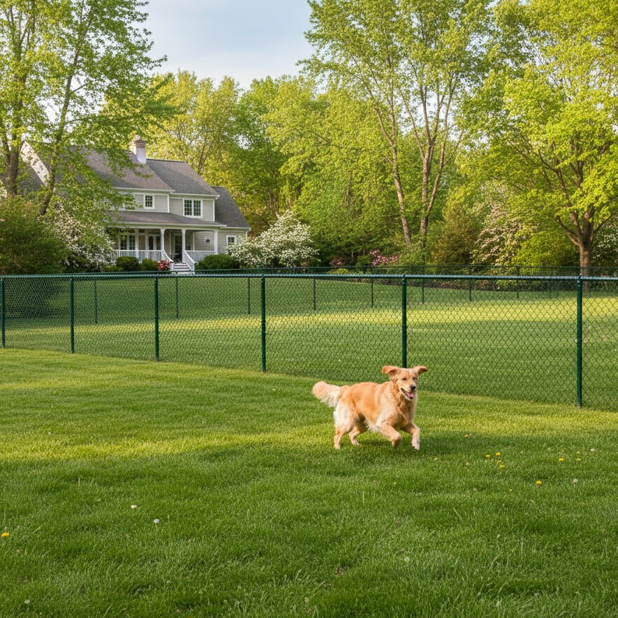 Chain link fencing is affordable durable and quick to install. Adding PVC coating softens the look and prevents sharp contact points. It allows full visibility while keeping your dog safely inside the boundary. It also works well for large yards and active pets.