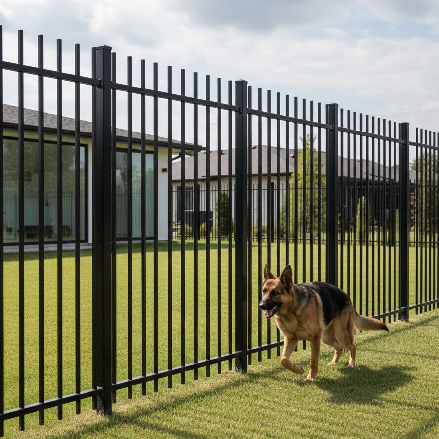 Steel fencing with vertical rods is strong and sleek. The vertical design prevents climbing and offers long term durability. It works well for strong or energetic breeds that need firm boundaries. Maintenance is minimal and the style suits modern homes.