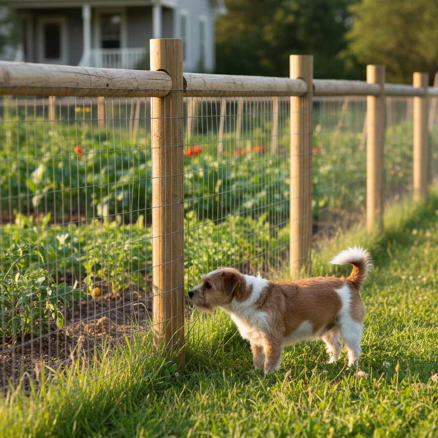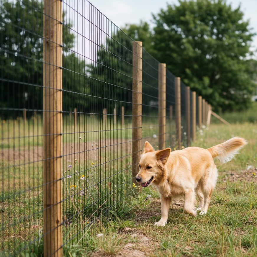 Mesh wire fencing is flexible and budget friendly. When wrapped tightly around sturdy posts it prevents squeezing digging and escaping. It is a great option for large uneven yards where traditional panels may not fit perfectly. It also blends easily with greenery.