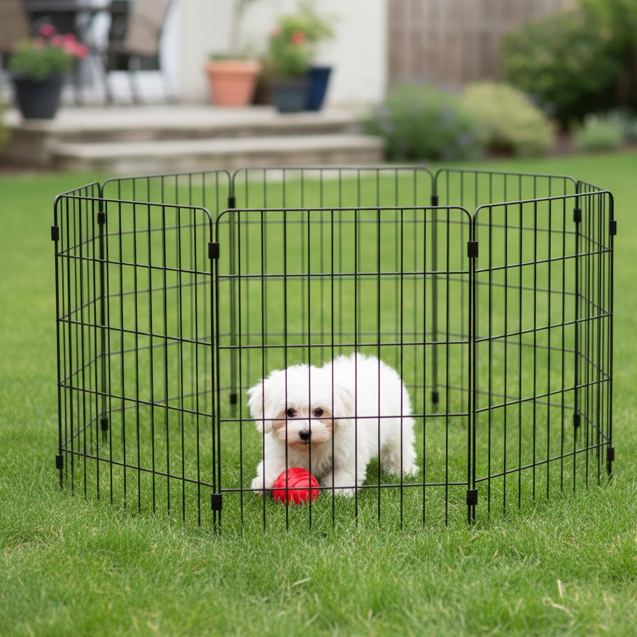 Portable fences are useful for rented homes balconies or temporary outdoor setups. They fold store and move easily while still giving your dog a safe play space. This idea works best for small to medium dogs and supervised outdoor time.