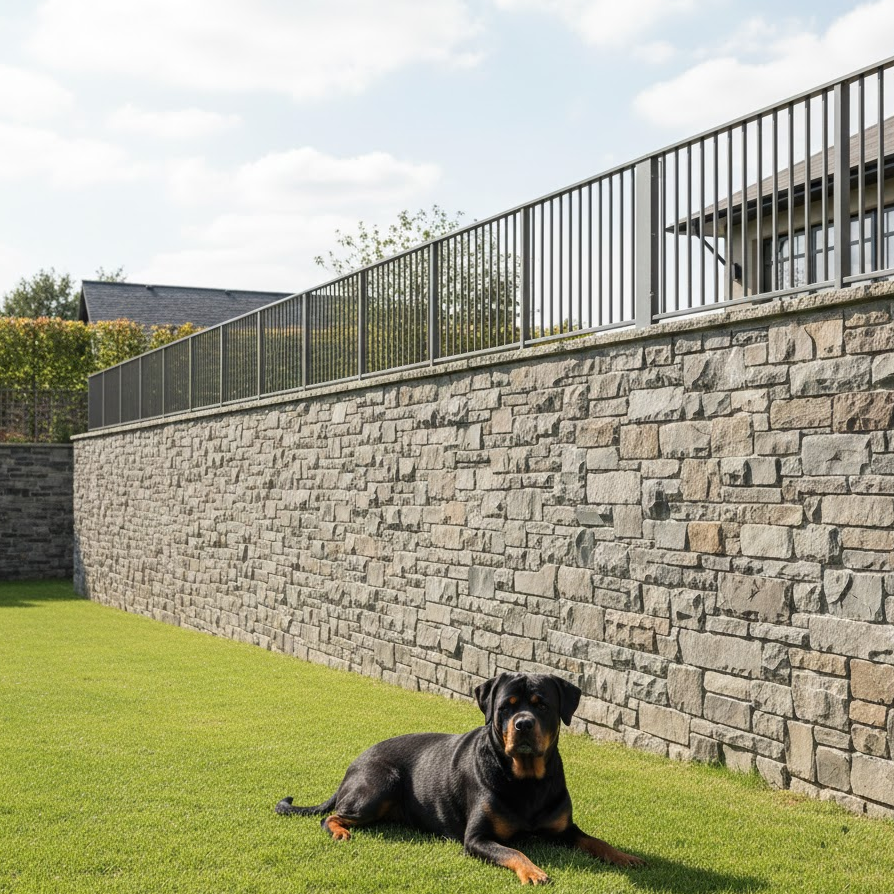 A stone wall adds timeless charm and great stability. Adding a secure railing on top increases height for extra safety without making the yard feel closed off. This combination suits strong dogs and keeps the space visually balanced.
