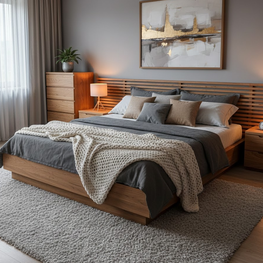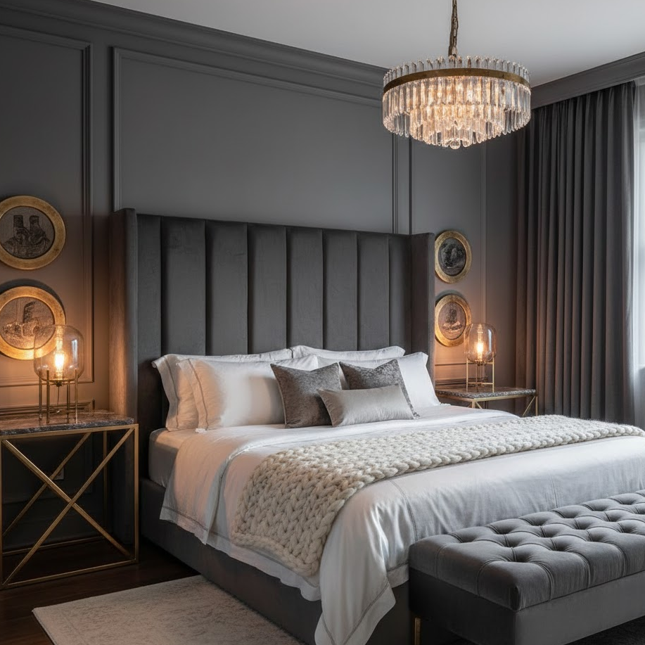 Deep grey shades combined with velvet fabrics, metallic finishes, and layered lighting create a luxurious bedroom feel. Use plush bedding and statement headboards to enhance elegance. This style is ideal for those who want a hotel inspired bedroom at home.