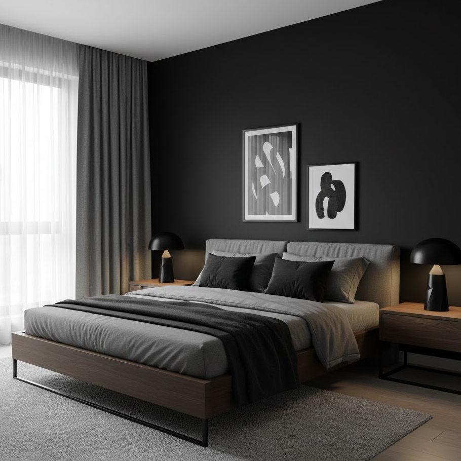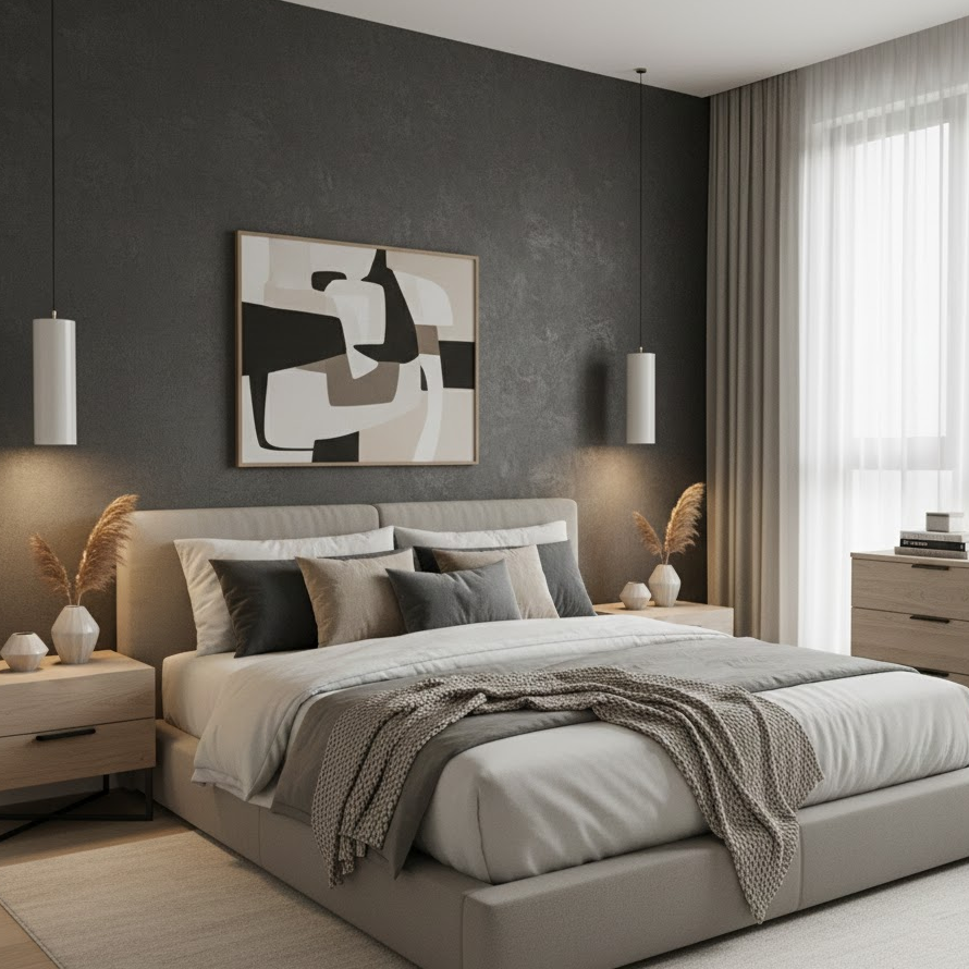 A dark grey accent wall adds depth and character to the bedroom without overwhelming the space. It works best behind the bed as a focal point. Pair it with lighter walls and soft lighting to maintain balance. This idea brings a modern and bold touch to the room.