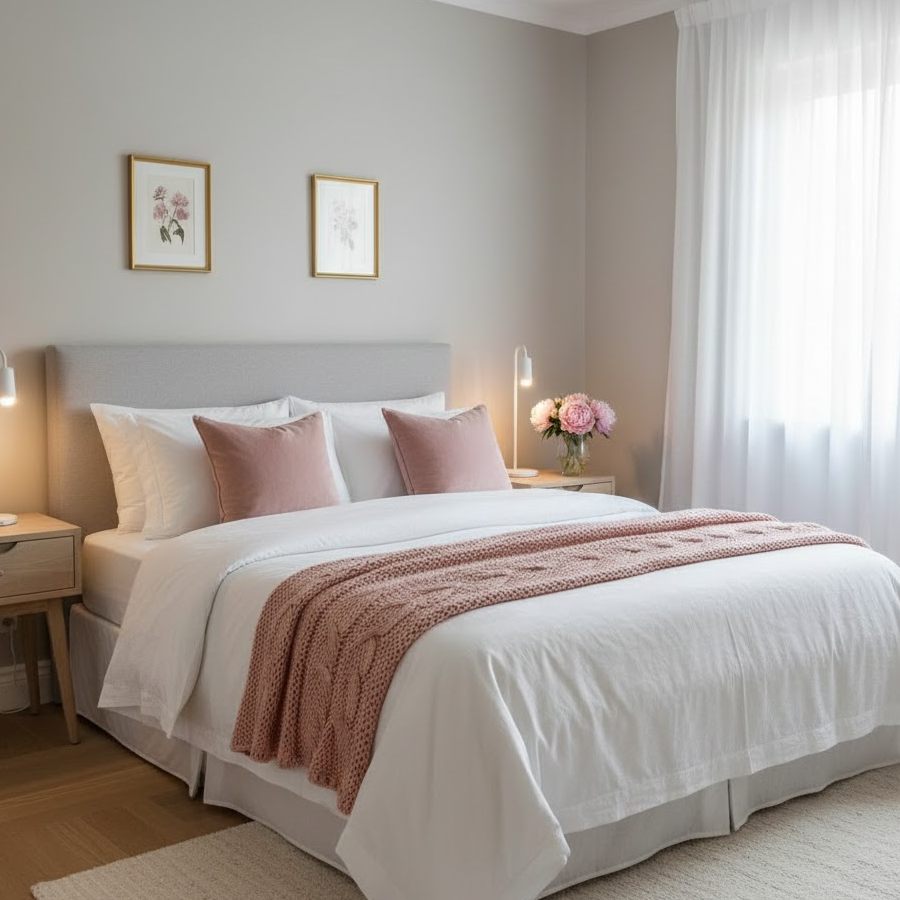 Soft grey walls paired with pastel accents like blush pink or baby blue create a gentle and relaxing bedroom vibe. Pastels add subtle color without overpowering the space. This style feels elegant, calm, and perfect for a restful bedroom setting.