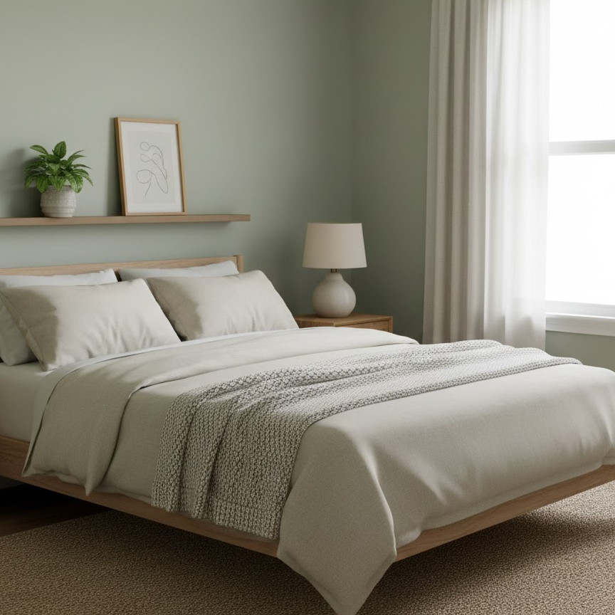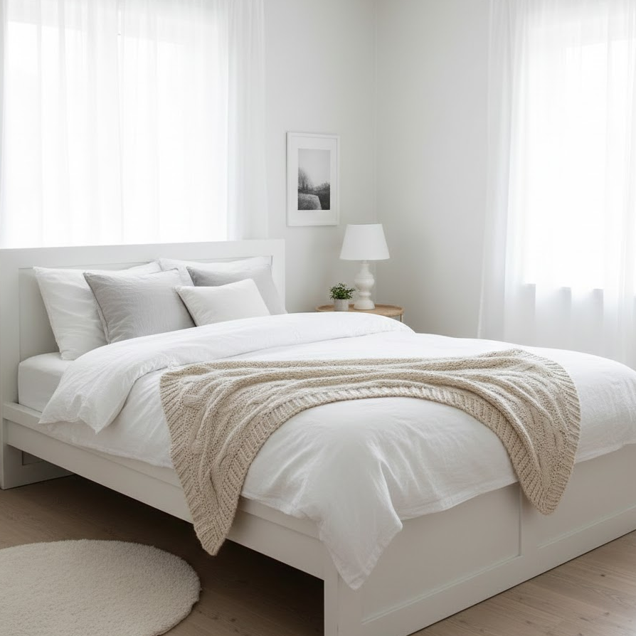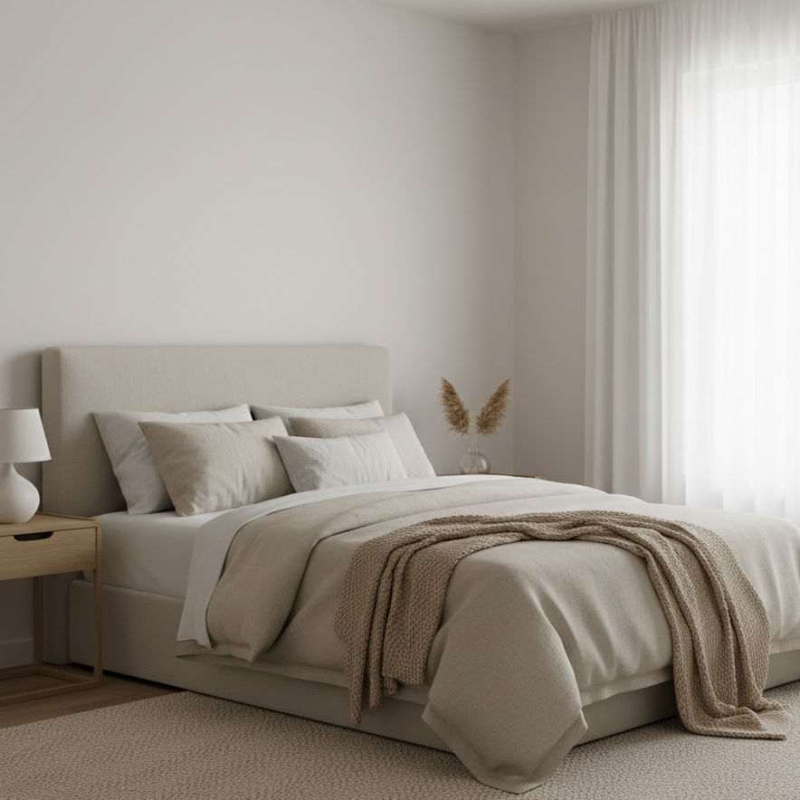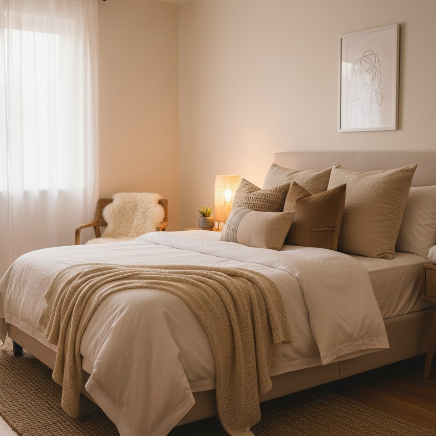 A cozy guest bedroom focuses on warmth comfort and softness. Use warm neutral colors layered bedding and plush pillows to create an inviting feel. Add a soft throw blanket and textured cushions to make the bed look welcoming. Gentle lighting and simple decor help the room feel relaxed and comforting for guests.