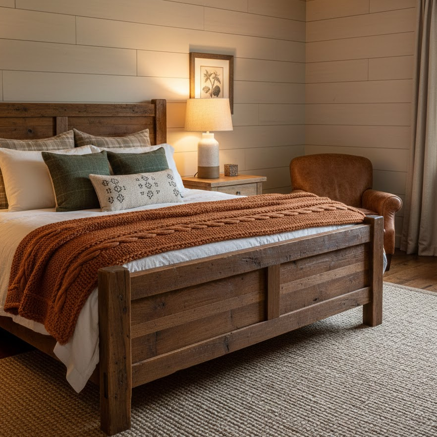 Rustic decor brings warmth through natural materials and earthy colors. Wooden furniture textured fabrics and simple patterns create a cozy atmosphere. This style works well for homes that want a relaxed and grounded guest bedroom feel.
