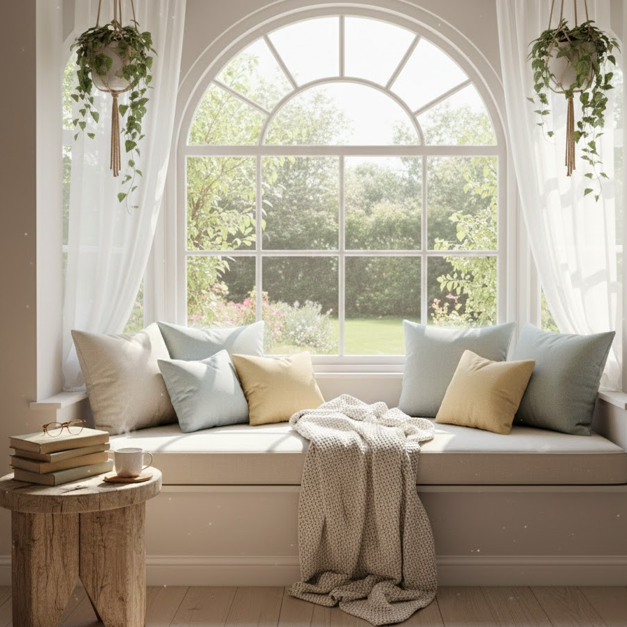 Transform the space near a window into a cosy reading nook. Add comfortable seating soft cushions and a small side table. Natural light enhances the reading experience and brings calmness to the space while keeping the area visually bright and inviting.