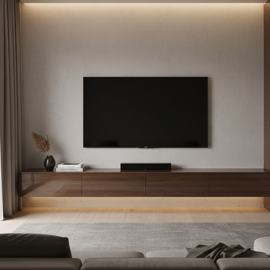 A floating TV unit keeps your space feeling open and modern. It works well in small rooms and allows for easy cleaning underneath. Choose sleek wooden or glossy finishes to blend with your décor. Add a few soft lights below or around the unit to create depth and make the TV wall look polished without adding bulk.