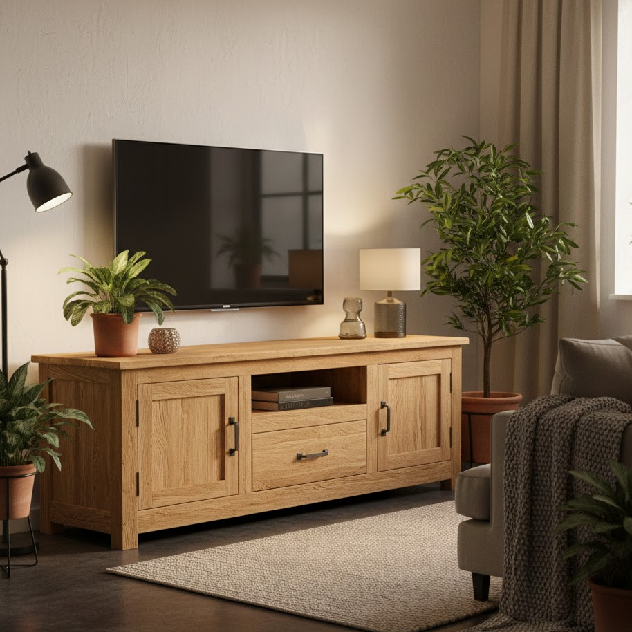 Combine style and utility with a TV unit that includes cabinets, drawers and open shelves. This setup keeps all remotes, wires and accessories tucked away neatly. The mix of open and closed storage allows you to display décor while hiding clutter. It works well for families who need organized space without compromising on aesthetics.