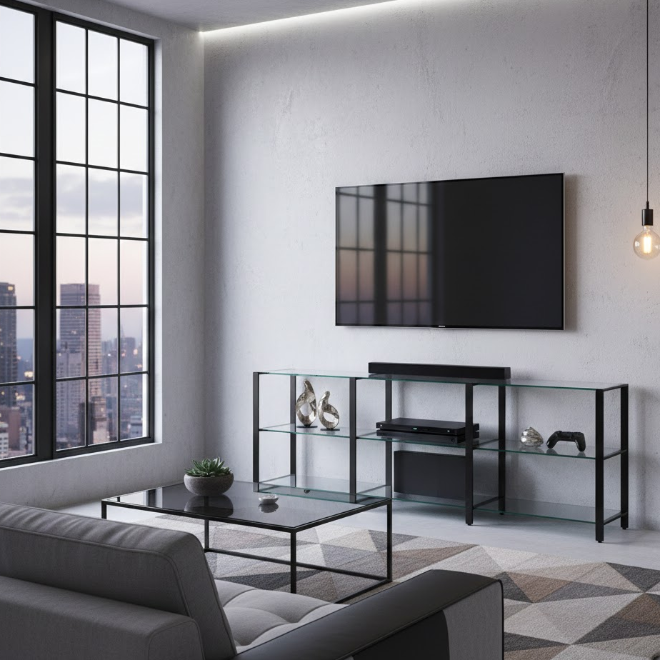 A mix of glass shelves and metal framing creates a chic, contemporary look. It feels lightweight but stylish, perfect for modern urban homes. The reflective surfaces also help brighten the space. Use this design when you want a TV unit that stands out without making the wall look too crowded or heavy.