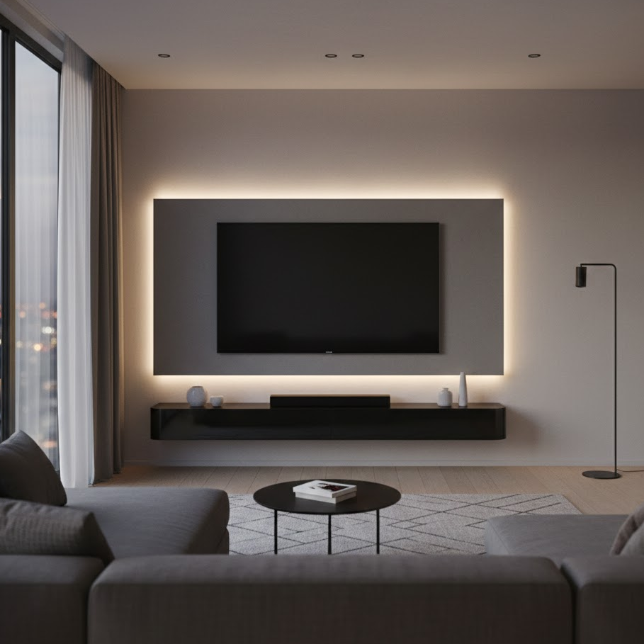 Add a soft LED glow behind the TV for a dramatic yet relaxing effect. This style enhances the viewing experience and makes the wall look more artistic. Pair the lighting with a sleek panel or a simple floating shelf for balance. It works especially well in rooms where you want a modern, ambient atmosphere.