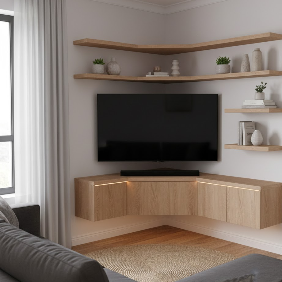 Make smart use of corners by installing a compact corner TV unit. It saves space, keeps the room open and works great in smaller homes or bedrooms. Add a few floating shelves around the corner for décor or storage. This setup maintains balance while creating a unique viewing angle that feels cozy and practical.