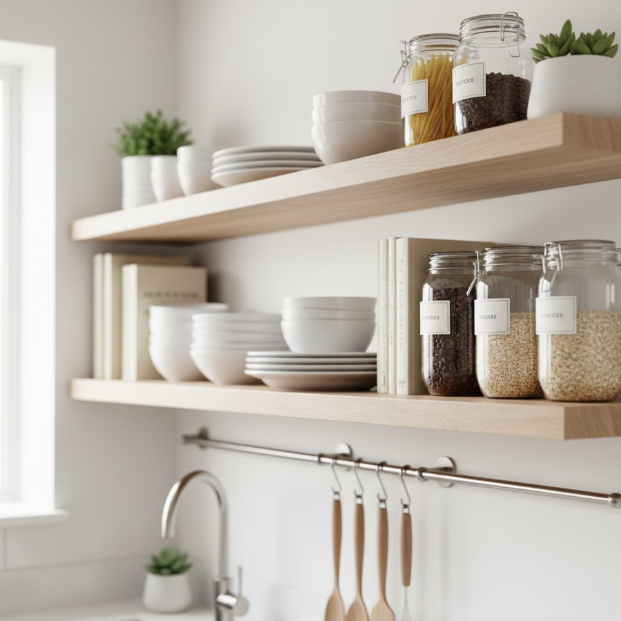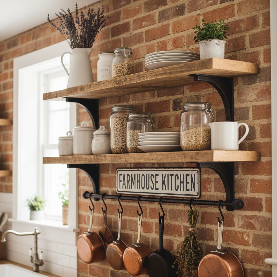 Open shelves on kitchen walls allow you to display plates, jars, cookbooks, and small plants. This decor idea makes the kitchen feel open and organized. Use matching containers or neutral colors to keep it clean. Open shelf styling adds beauty while keeping essentials easy to access.