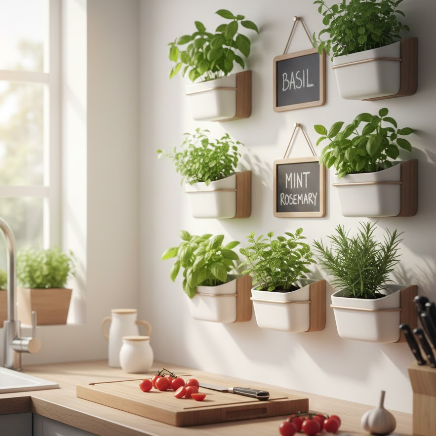 Herb wall decor is both practical and decorative. Wall-mounted planters or small pots with herbs like basil, mint, or rosemary add freshness to your kitchen. This idea keeps your walls green and lively while giving easy access to fresh herbs. It’s perfect for small kitchens where counter space is limited.