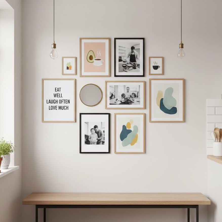 A kitchen gallery wall adds personality and creativity. You can display food illustrations, quotes, family photos, or minimal art prints. Use matching frames for a clean look or mix styles for a fun vibe. Gallery walls are an easy way to make your kitchen feel unique and visually interesting.