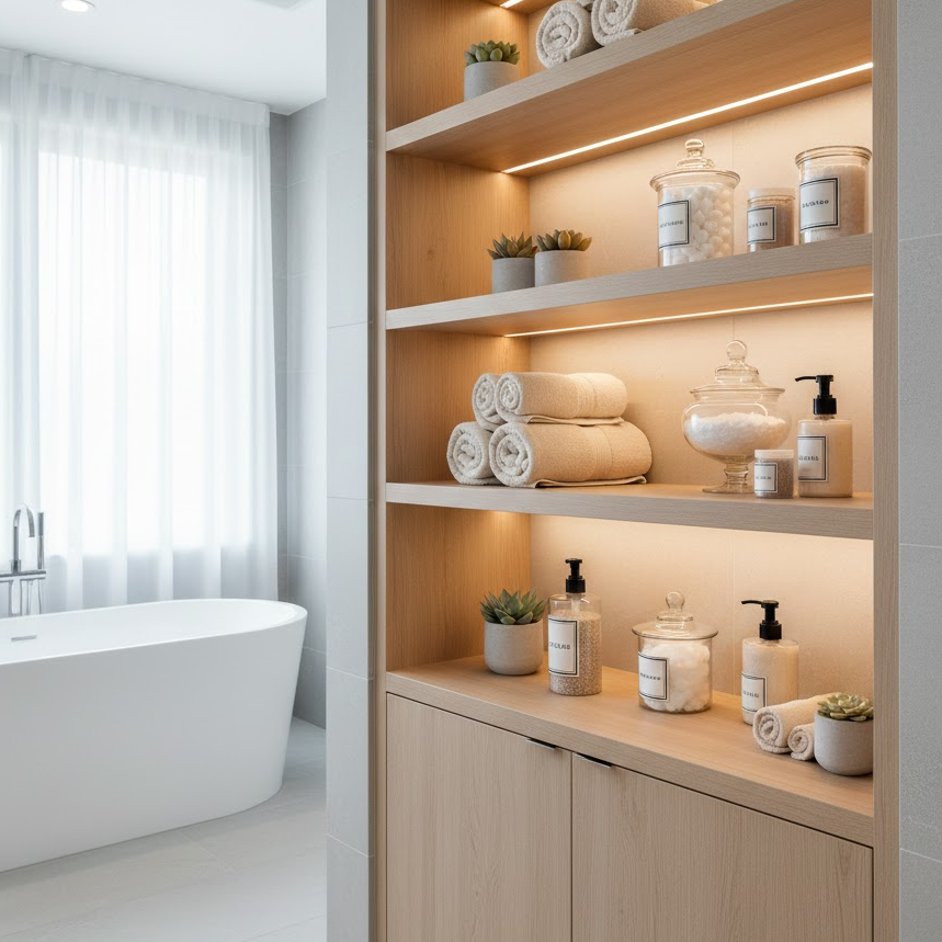 Clutter can ruin even the most beautiful bathroom. Therefore, incorporating smart storage solutions is essential. Built in shelves, vertical cabinets, and drawer organizers keep everything in place. Additionally, hidden storage behind mirrors maximizes space. When your master bath remains organized, it feels more peaceful and visually appealing.