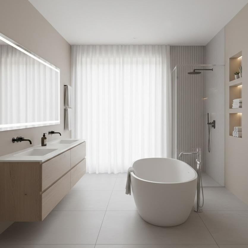 Choosing a neutral color scheme such as white, beige, or soft grey can make your master bathroom feel spacious and calm. Moreover, neutral tones allow you to easily change decor accents over time. When combined with natural materials like wood or stone, the result is a balanced and inviting environment.