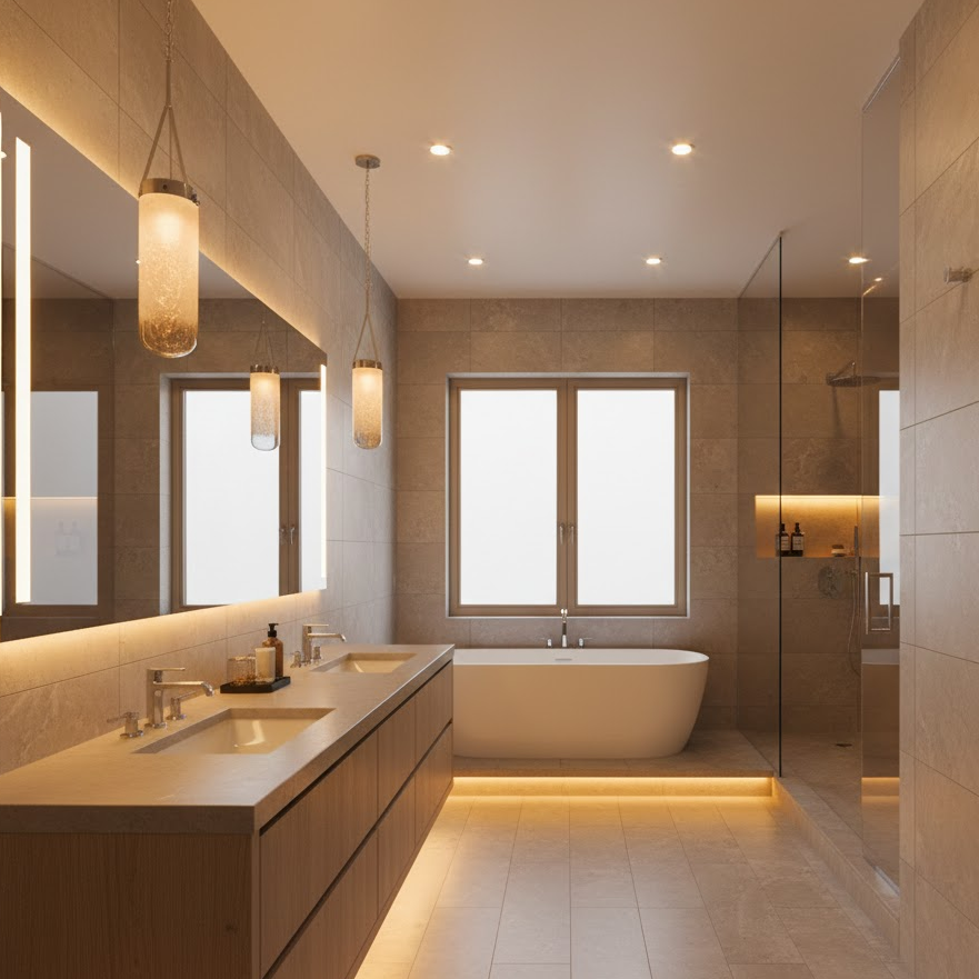 Lighting plays a crucial role in any master bathroom remodel. Layered lighting, including vanity lights, ceiling fixtures, and accent lighting, creates both function and ambiance. For example, warm LED lights around mirrors improve visibility while adding a soft glow. As a result, your master bath feels cozy yet practical at the same time.