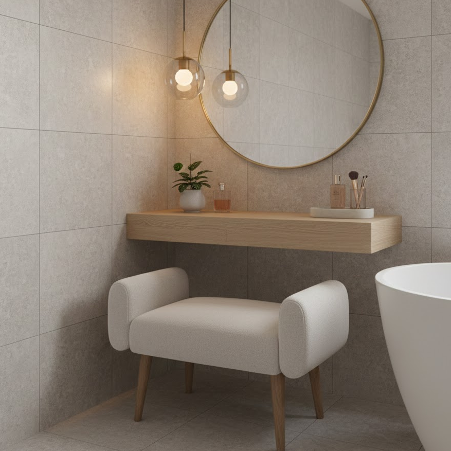 If space allows, adding a small seating area or makeup vanity enhances comfort. A simple bench or upholstered stool can make daily routines easier. Furthermore, this addition adds a touch of luxury master bath design. It creates a functional corner that feels thoughtfully planned and refined.