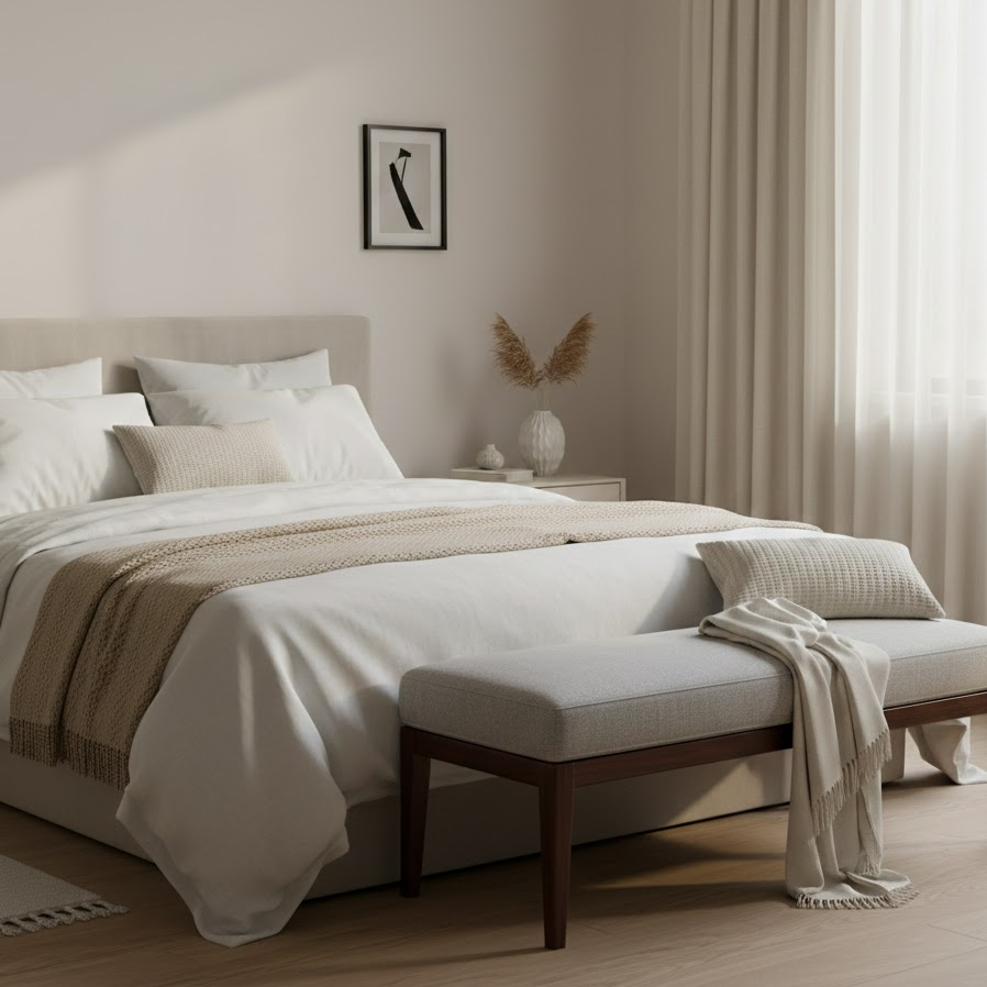 A small sofa bench placed at the foot of the bed adds both function and elegance. You can sit comfortably while getting ready or place clothes on it. This idea works well in compact bedrooms with limited seating options.