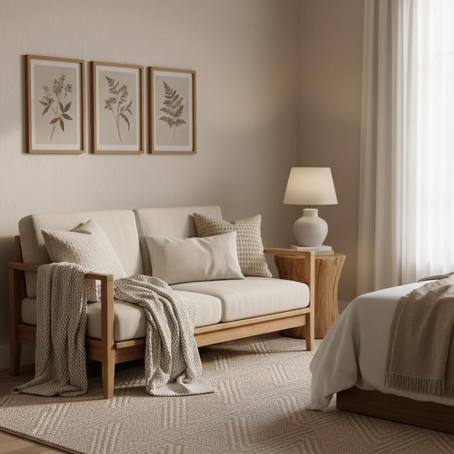 A wooden frame sofa adds a natural and timeless touch to bedroom decor. It looks stylish and remains durable for long term use. Add soft cushions to balance comfort and design in your bedroom seating area.
