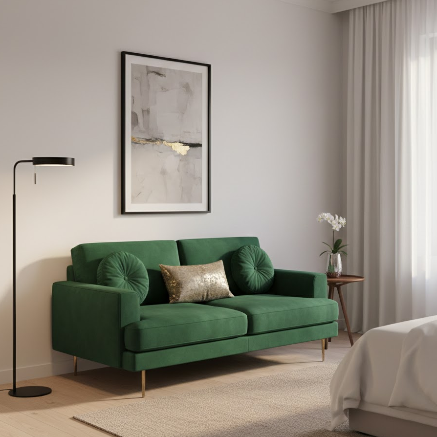 A compact two seater sofa works perfectly in a bedroom. It provides comfortable seating without overcrowding the space. Place it near a window or at the foot of the bed to create a relaxing sitting area while keeping the bedroom open and airy.