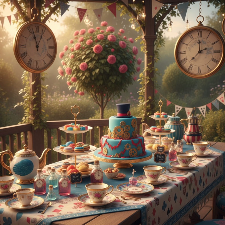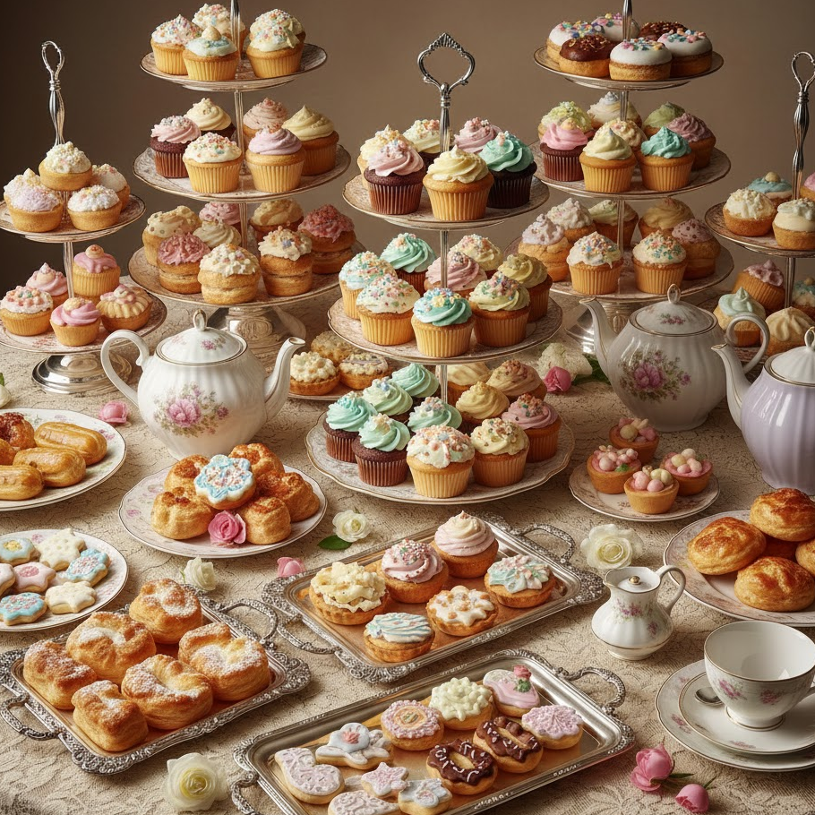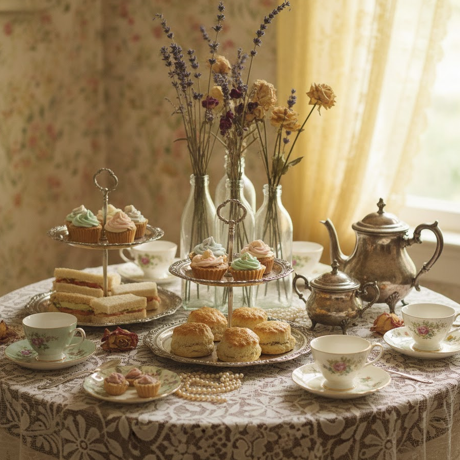 A classic afternoon tea party features elegant tableware soft colors and traditional treats. Use teacups saucers and tiered trays for presentation. Serve a variety of teas along with finger sandwiches scones and small desserts. This timeless setup creates a refined and relaxing experience for guests.