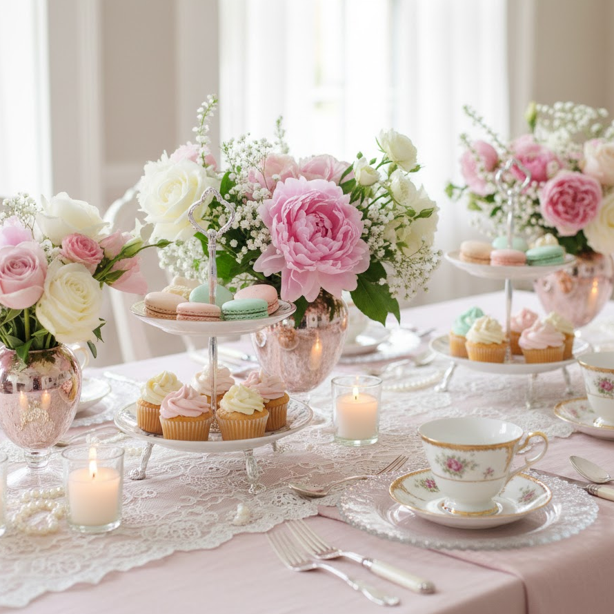 A vintage tea party adds charm and nostalgia. Mix and match antique teacups lace tablecloths and old style serving trays. Soft pastel colors and delicate florals help complete the look. This theme feels intimate and visually appealing.