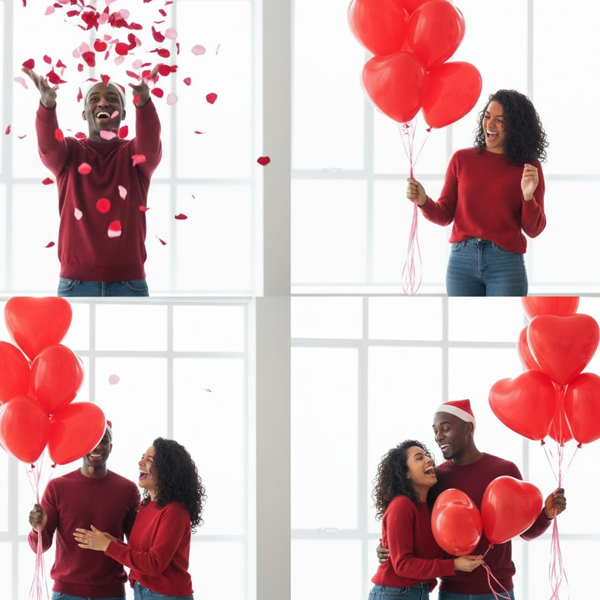 - Balloon Fun: Use red or pastel balloons to bring a cheerful playful vibe to your photos.
